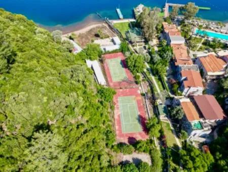 Our private use area, which has a front of 50 meters to the sea, including 2 old stone houses, 5 prefabricated buildings, 2 tennis courts, on a 4500 m2 plot by the sea in Marmaris Adaköy, is for sale. There are very valuable properties in this bay, which we call the paradise part of Marmaris, and there is the most beautiful hotel in the world right next to it. Our plot has no cadastral road. You can go to the land by sea transportation.